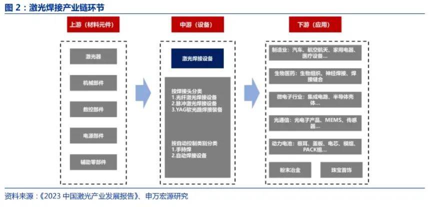 从激光焊接产业链环节来看:1)上游:核心部件为激光器、数控系统、机械部件、电源部件等,其中:激光器作为激光加工的“心脏”,是激光加工设备核心动力来源,主要企业包括:IPG、锐科激光、创鑫激光、杰普特等;数控系统为工业机器人的“大脑”,主要通过运动控制核心算法、软件控制技术、硬件控制技术等控制工业机器人运动,直接决定着工业机器人的稳定性与精确性,主要成熟及储备参与企业如:Scanlab、金橙子、柏楚电子等;2)中游:主要为激光焊接设备,分为手持焊及自动化集成焊接设备,其中,手持焊设备企业,如:IPG、光惠激光、铭镭激光等,自动化集成焊接设备企业,如:通快、联赢激光、大族激光、华工科技、逸飞激光等;3)下游:为各类应用场景,涵盖消费电子、动力电池、汽车等等。