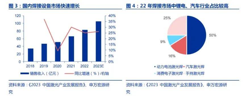 2022 年激光焊接设备市场规模 83.1亿元,下游市场中动力电池、汽车、消费电子等占比居多。激光焊接在动力电池、汽车、消费电子等领域应用逐渐增加,2022 年国内激光焊接成套设备市场销售收入为 83.1亿元,2018-2022年CAGR为 24.85%。从下游应用行业来看,2022年市场中动力电池激光焊接设备占比提升至 50%,未来随着汽车焊接消费电子激光焊接、手持激光焊发展,预计激光焊接仍将保持快速增长,根据《2023中国激光产业发展报告》数据,2023年市场空间达到约104.8亿元。