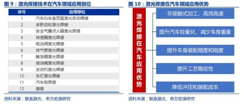 根据国家《节能与新能源汽车技术路线 年汽车车辆整备质量较 2015年减重10%、2025年较2015 年减重20%、2030年较2015年减重35%。汽车轻量化是未来我国汽车产业持续健康发展的必然选择,作为节能汽车和新能源汽车的共性核心技术轻量化存在巨大的市场空间。焊接工序在汽车生产加工过程中是一项不可或缺的工序,比如车架、车身、车厢、发动机、汽车齿轮、车顶、车门等都离不开焊接技术。对比传统的焊接技术如:电阻焊接,二氧化碳气体保护焊等,激光焊接运用于汽车上可以降低车身重量、提高车身装配精度、增加车身的强度、降低汽车车身制造过程中的冲压和装配成本。