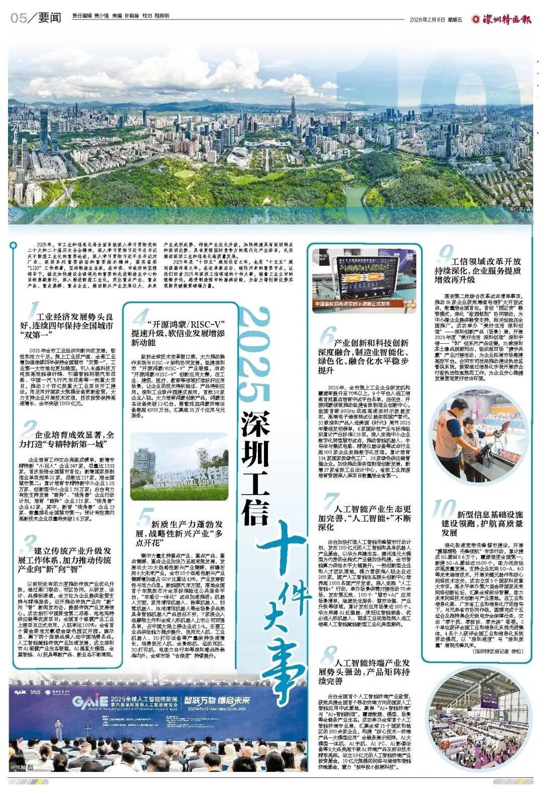 深化极速宽带先锋城市建设,开展“鹏城满格 先锋领航”专项行动,累计建成5G基站8.6万个,覆盖密度全国第一,新建5G-A基站近5500个,助力低空经济高质量发展。支持企业布局5G-A、6G等未来通信技术,开展关键元器件和核心网络技术攻关,成功立项5个国家科技重大专项。高水平举办第六届金砖国家未来网络创新论坛,汇聚全球前沿智慧,助力未来网络技术创新与产业落地。在工业和信息化部、广东省工业和信息化厅的指导下,与兄弟省市协同作战,圆满完成十五运会及残特奥会无线电安全保障任务,交出“零干扰、零投诉、零失误”答卷。2个单位获评全国工业和信息化系统先进集体,4名个人获评全国工业和信息化系统劳动模范,以“深圳速度”与“深圳质量”展现先锋风采。