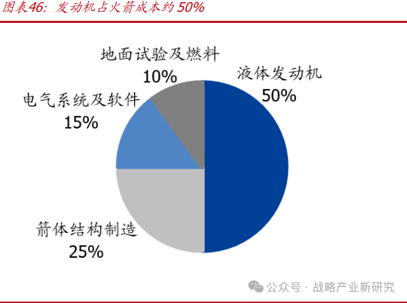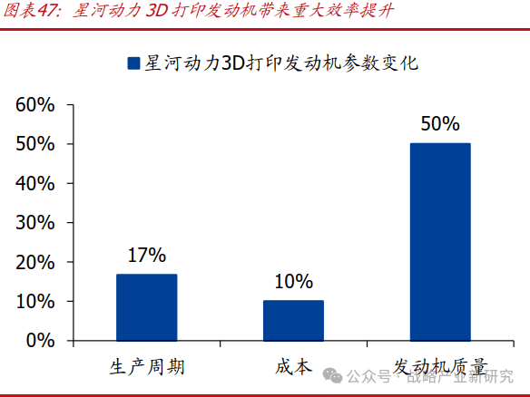 3D 打印航天发动机技术成熟,可实现最高 90%降本。发动机是火箭最大成本来源,占比约 50%。传统火箭发动机制造周期长、成本高,通常需耗时约 6 个月。3D 打印能用最少的材料实现相同结构的性能,减少了昂贵材料的消耗;除此之外,3D 打印复杂结构、一体化制造的特点,让零件大量整合,极大减少数量,使发动机结构极度简洁,减少了对极高技艺工人的需求度,减少了隐患;进一步的,这种生产特点减少了发动机组装生产环节,提升了制造效率,更进一步降低了制造成本,同时在规模化量产中保证了发动机性能的一致性。